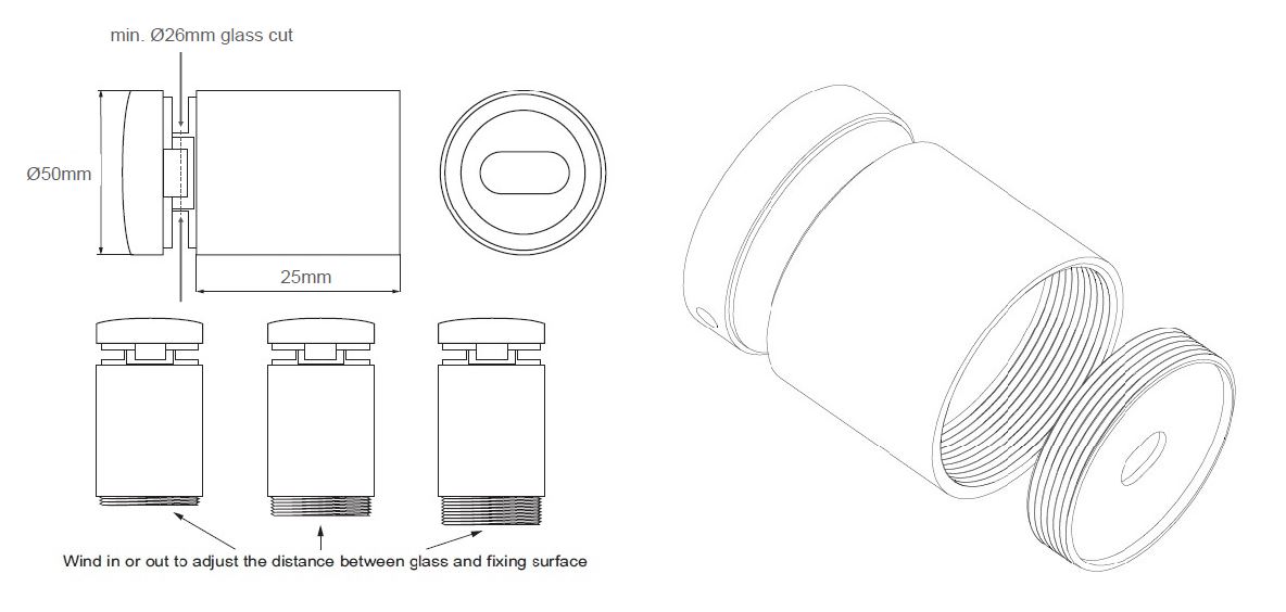 Adjustable Stand-Off Glass Holder,SS316,Brushed,ø50x25mm, F/ 6,76-17,5mm. Glass, W/M10x40mm Threaded Rod