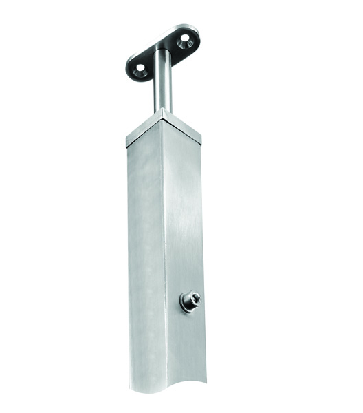 Baluster Post SS304, 40x40x1,5mm, L 879mm, 90DG, Fixed Hand Rail, 2 Holes On 2 Side W/M8x14mm Screws F/Clamps,Incl. Base Cover Cap & 4 Floor Plugs & Screws, W/Flat Handrail, All Brushed SS304, (Glass Clamps to Be Bought Seperately)