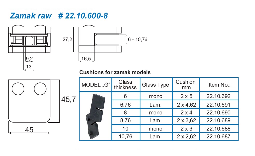Glass Clamp "Square" 45,7x45x27mm, Zamak-Raw, Flat, 6-10,76 mm Glass Thickness, No Safety Pin & No Cushions (Cushion Model G)