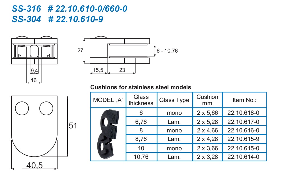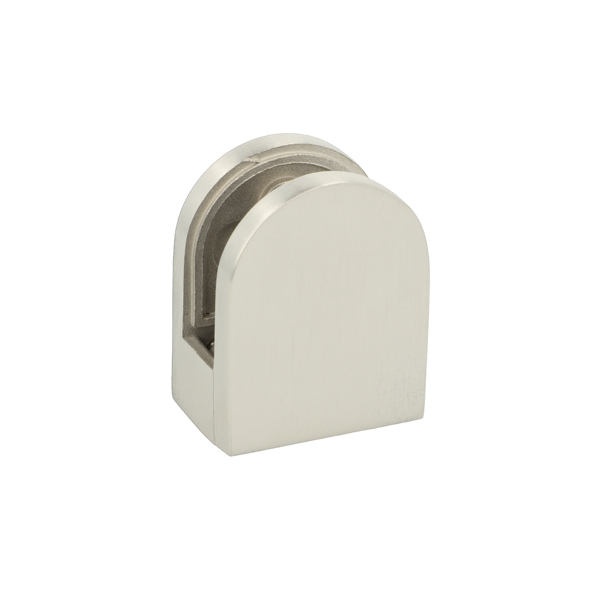 Glass Clamp "Oval-S" 40,5x51x27mm, SS304-Brushed, Flat, 6-10,76mm Glass Thickness, No Safety Pin & No Cushions (Cushion Model A)