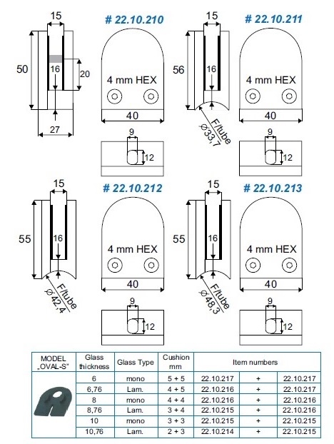 Glass Clamp "Oval-S" 40x55x27mm, Zamak-Raw, ø42,4mm Tube, 6-10,76mm Glass Thickness,No Safety Pin & No Cushions