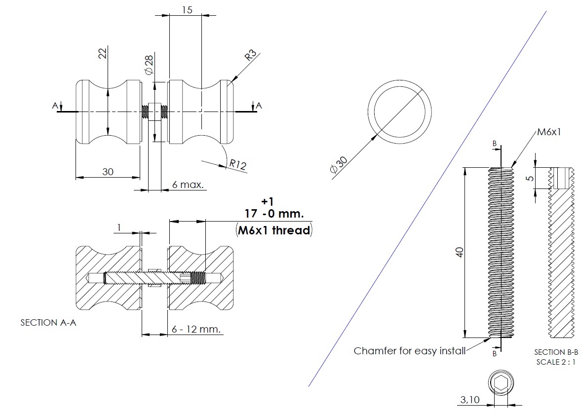 Brass Door Knob "Wien", ø30mm, Black finish, 6-12mm Glass, Drill Hole ø10 mm