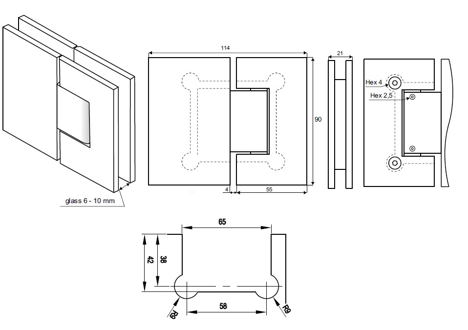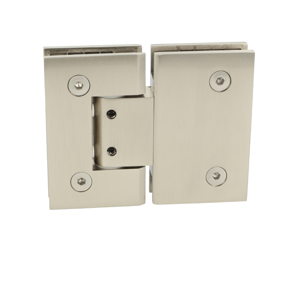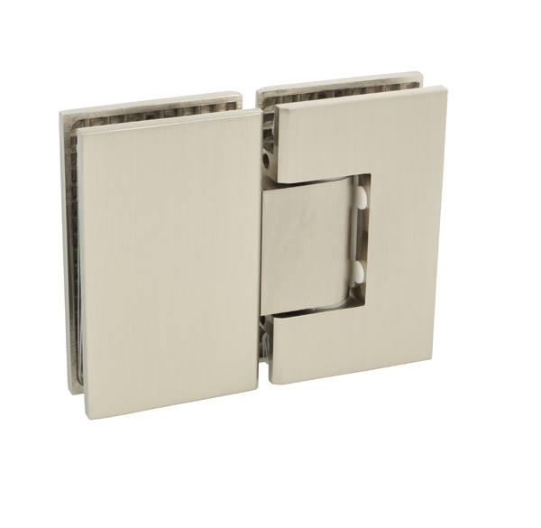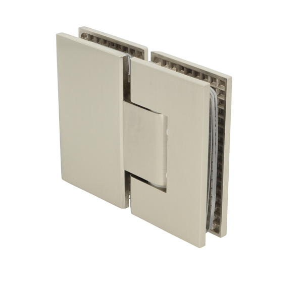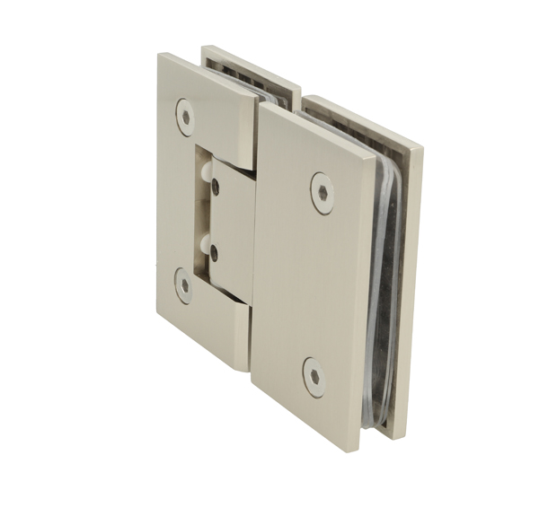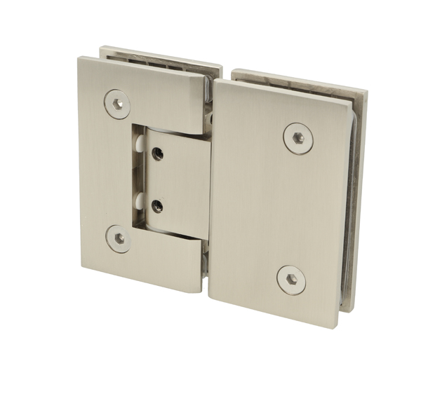 Shower Hinge "Tex II", 180DG, SS-Look, Glass/Glass, 6-10mm Glass Thickness, W/Angle Adjustment Function & 25DG Return Function, Brass Material, Straight Edges 2 x Transp. 1mm & 2 x Transp. Cushions 1.5mm Thickness