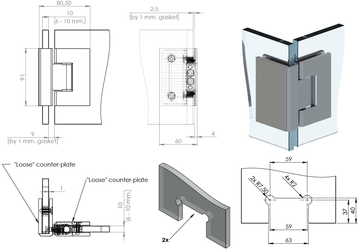 Shower Hinge "Tex III", 90DG, CPL, Glass/Glass, 6-10mm. Glass Thickness, W/15 DG Angle Adjustment Function & 25DG Return Function, Brass Material, Straight Edges. Incl. 4 x Transp. 1mm & 4 x Transp. Cushions 2mm Thickness