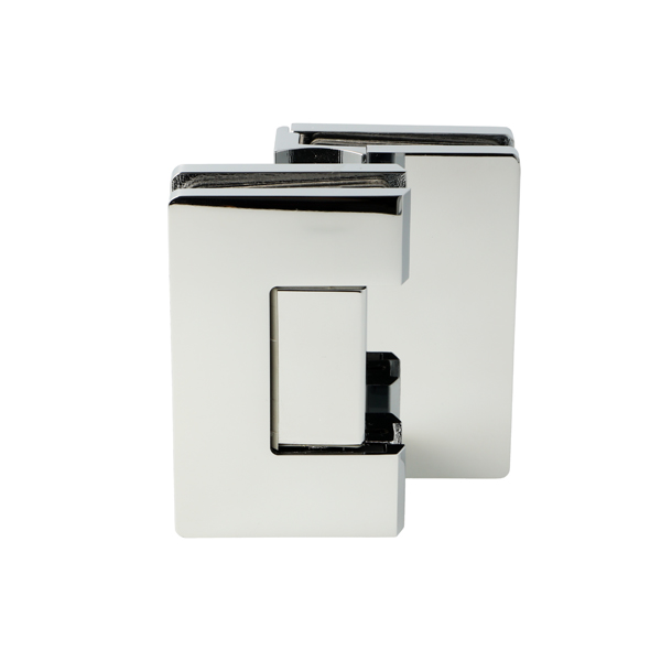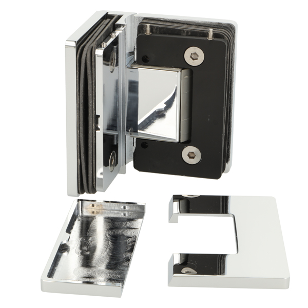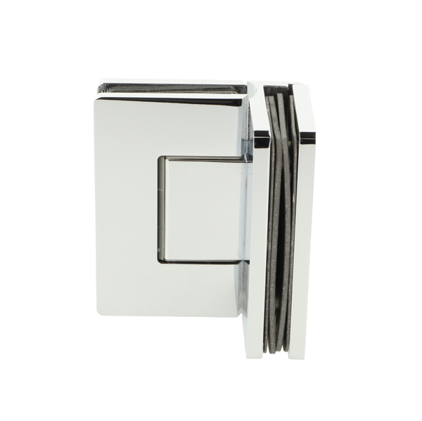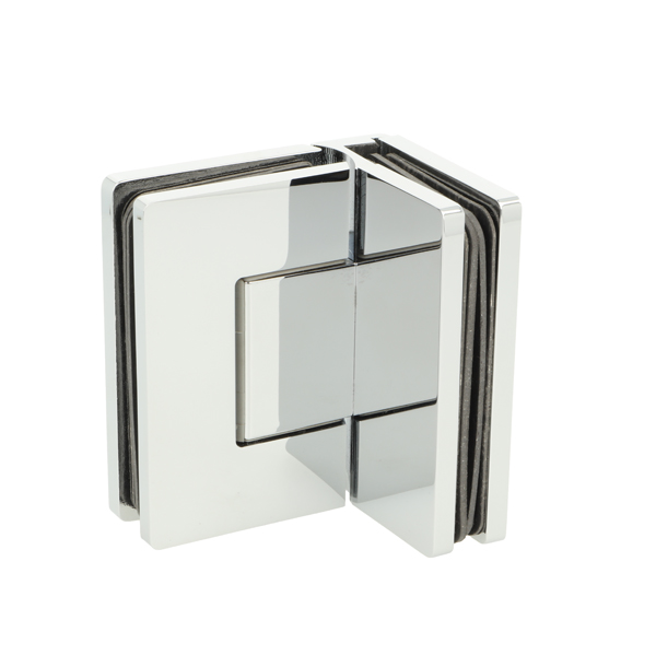 Shower Hinge "Rio", 90DG, CPL, Glass/Glass, 8-10mm Glass Thickness, W/15DG Angle Adjustment Function & 15DG Return Function, Brass Material, Hidden Screws. Black Fiber Gaskets: 2 x 1mm & 2 x 2mm Thickness. Load Capacity Pr. Pair: 45kg