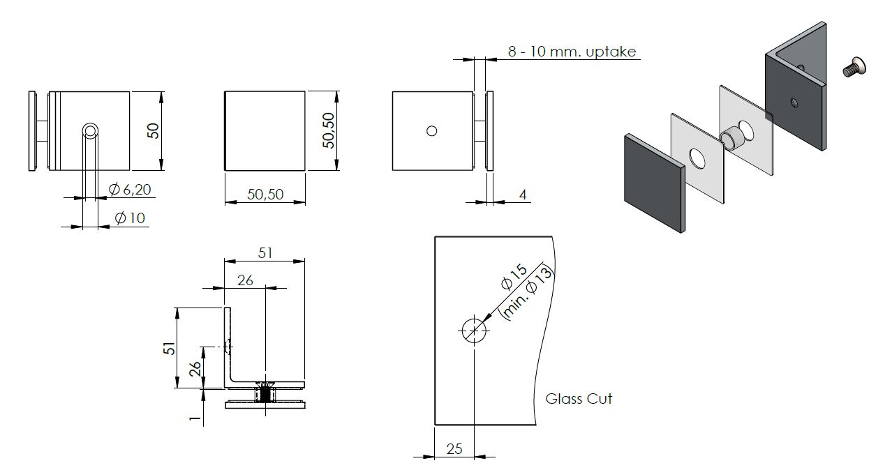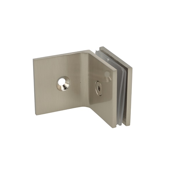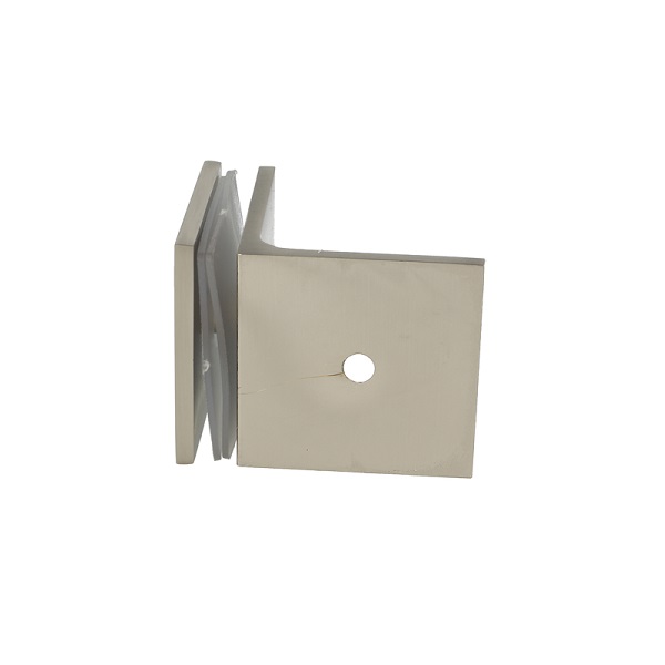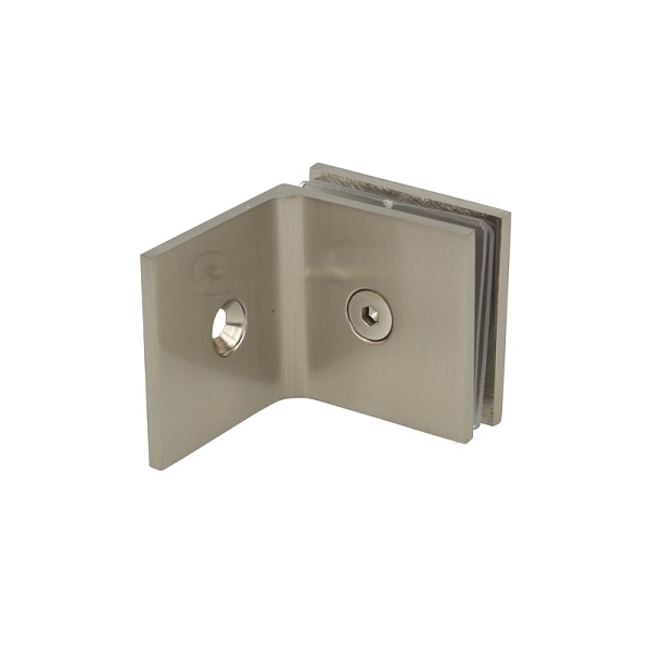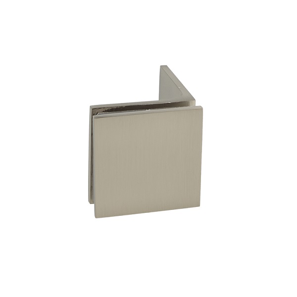 Glass Clamp "Bern", 90DG, SS-Look, Glass/Wall, 51x51x17mm, Square Corners, 8-10mm Glass, Wall Mounted By ø5mm Screw Hole, GLass Mounted By ø12mm Drilling, Brass Material