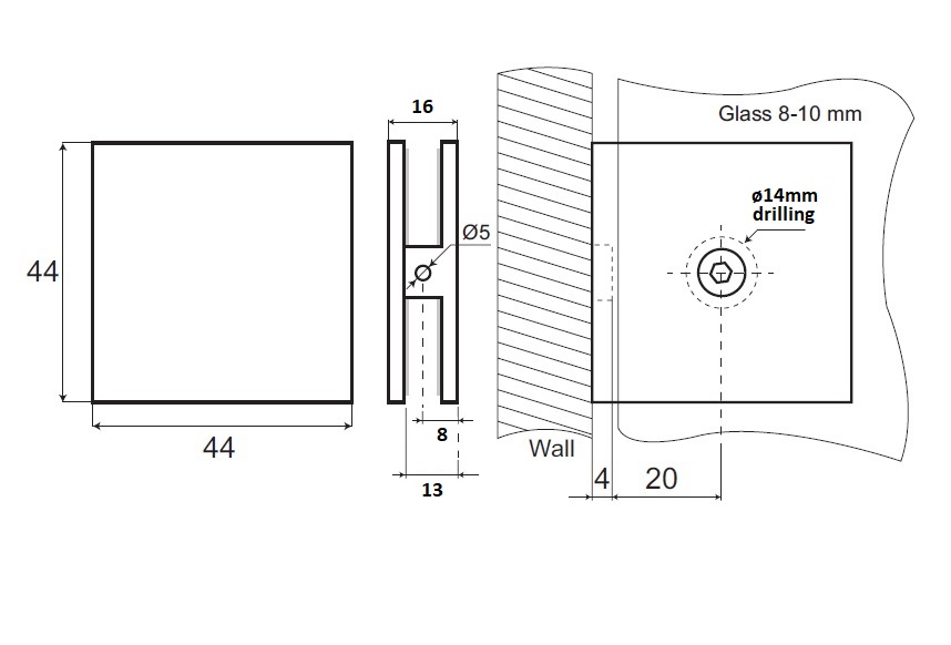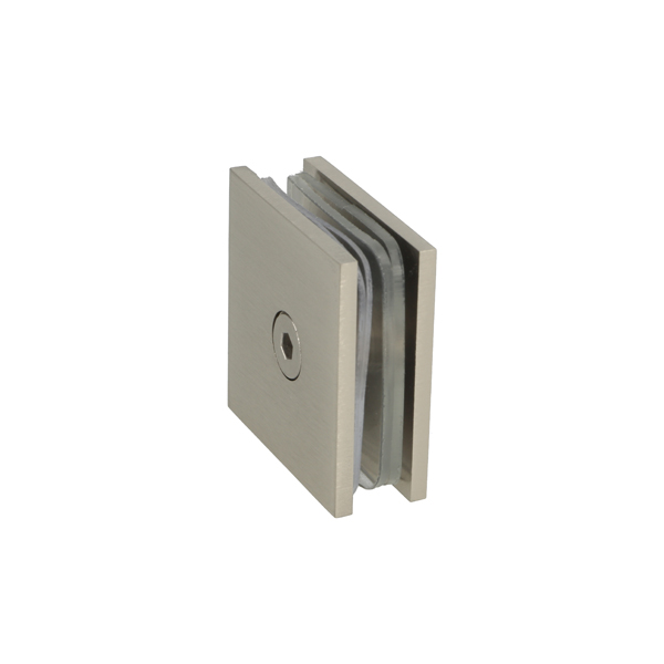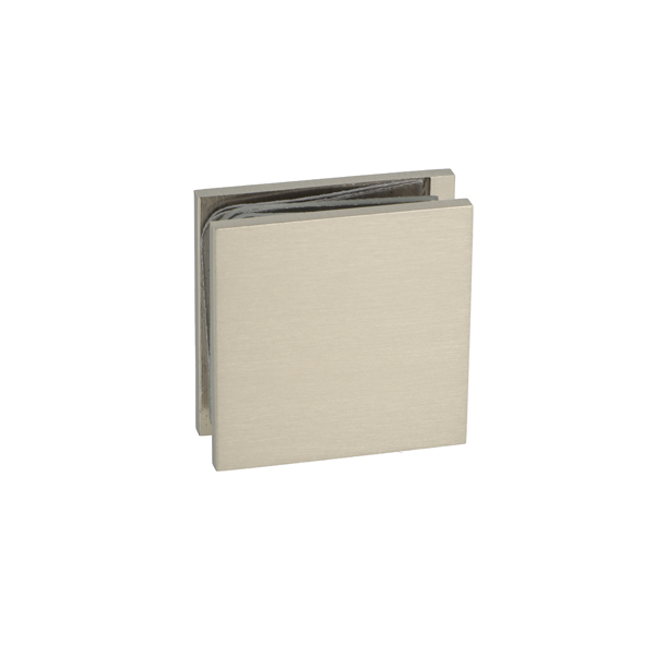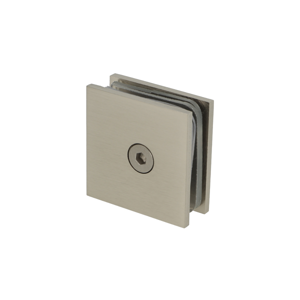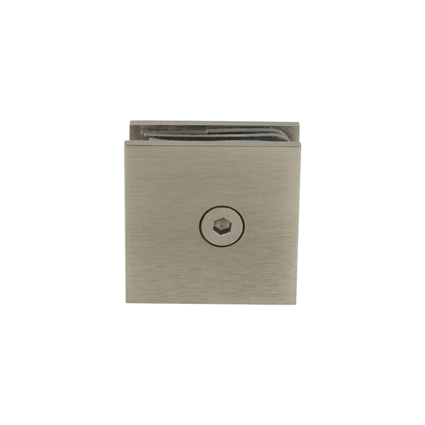 Glass Clamp "Berni", 180DG, SS-Look, Wall/Glass, 44x44x16mm, Square Corners, F/8-10mm Glass,Wall Mounted By 1 x ø5mm Screw Holes,Glass Mounted By ø14mm Drilling, Brass Material