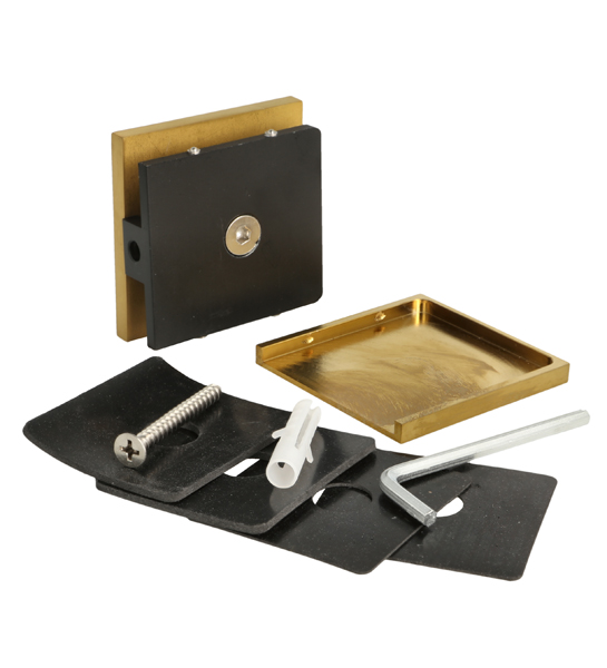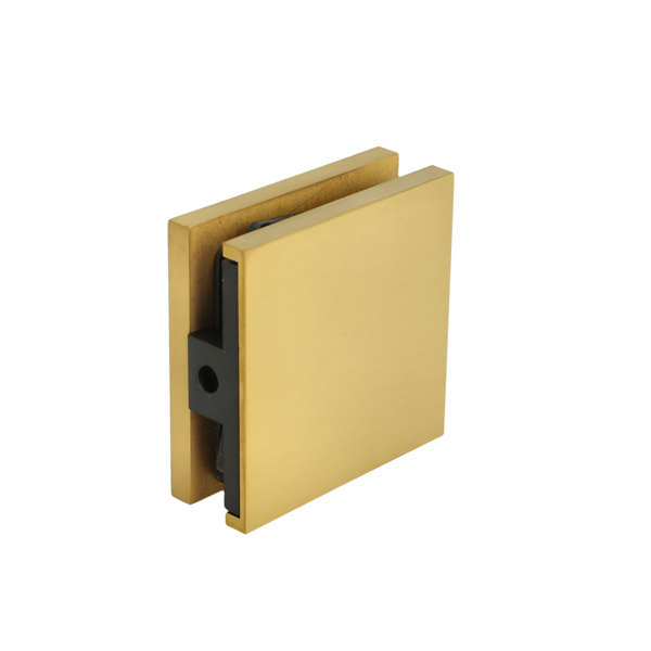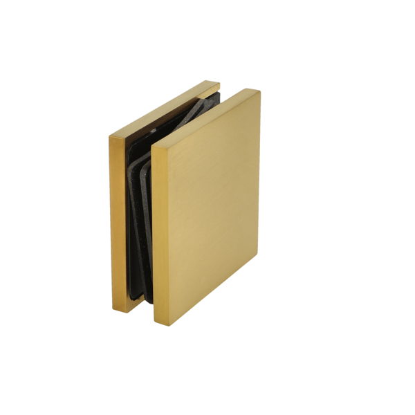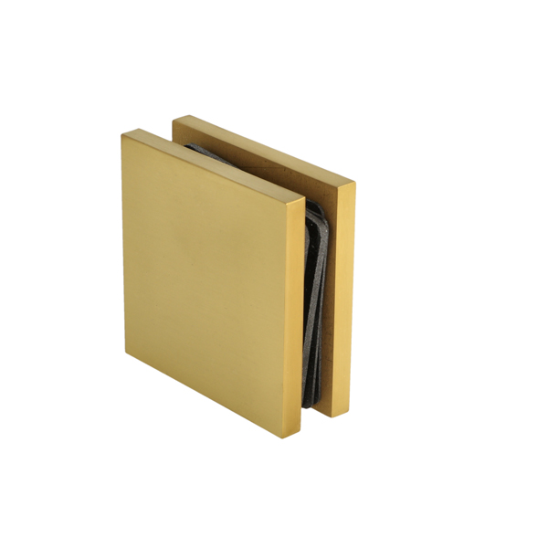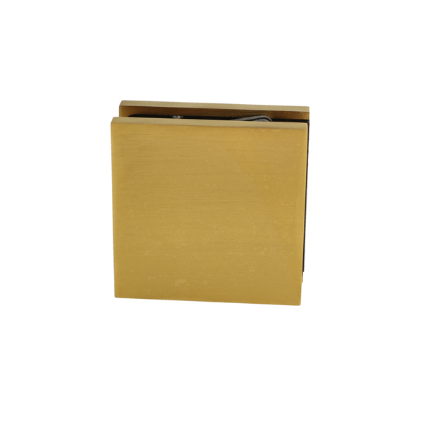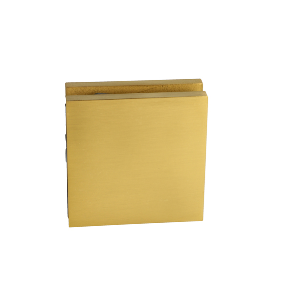 Glass Clamp "Lima", 180DG, Brushed Brass, Wall/Glass, 60x60x 20,5mm, F/6-10mm Glass, Wall Mounted By 1 x ø5mm Screw Hole, Glass Mounted By ø14mm Drilling, Hidden Screws, Brass, Alu & SS-304 Material