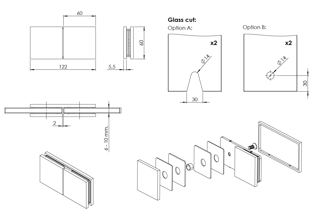 Glass Clamp "Lima", 180DG, CPL, Glass/Glass,122,4x60x20,5mm, 6-10mm Glass, Glass Mounted By ø14mm Drilling, Hidden Screws, Brass, Alu & SS-304 Material