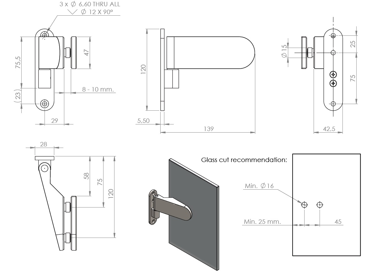 Glass Door Hinge "Bonn", Alu Anodized, Bracket Mounting, Load capacity 45 kg. each Hinge, 8-10mm Glass, Can be used for Left & Right Hand doors