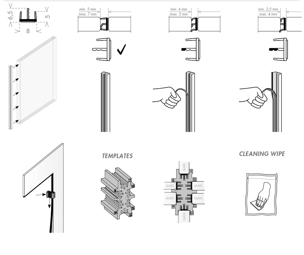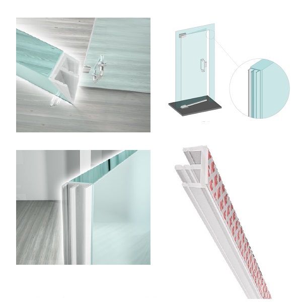 Transp. Adhesive PVC Profiles,F/Hinged Doors,10x3000mm, 8-14 mm Glass, Incl. 2 Templates & 2 Cleaning Wipes. To be used on Hinged Doors