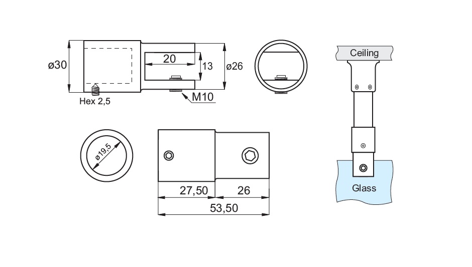 Bar To Glass Ceiling Bracket, F/ø19mm Tube, Brushed Brass, 8-10mm Glass