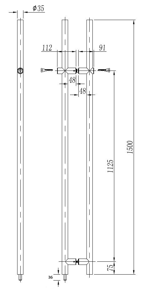 Door Bar Handle Lock ø35x1500mm, W/Knob On One Side, SS304 Brushed, Incl. Dust Free Floor Socket, F/8-12mm Glass, cc:1125mm, Cylinder Hole ø19 & Bottom Hole Ø13mm. Latch Size: 40mm