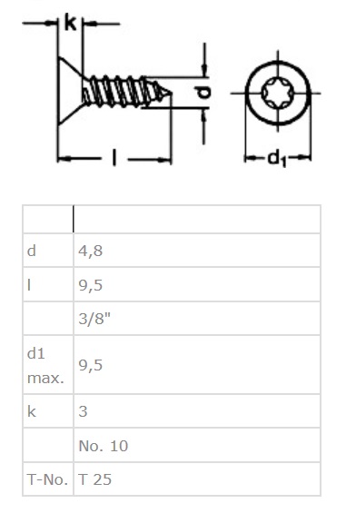 Self-tapping Screw ø4,8x9,5mm, DIN7982, A2, CSK, W/Torx 25, F/System "Zapp", Fixing of Hinge if using Glass Clip Profile 28.25.302-0