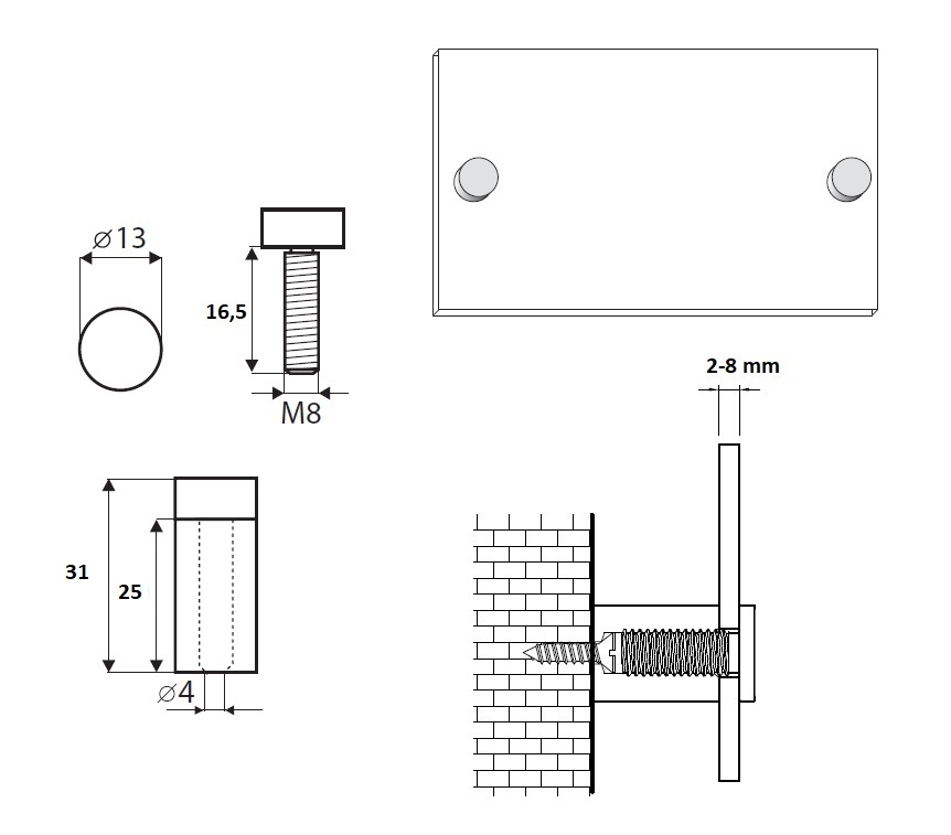 Sign Board Screw ø13x25mm, Alu, Anodized, M8, W/2 Trans- parent Washers