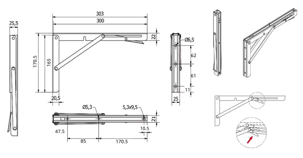 Folding Bracket, Steel, White, 300mm, Self Locking,Max Load: 60 KG pr. Pair, RAL 9016