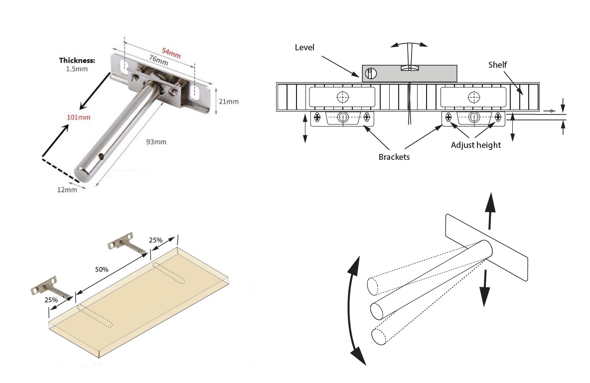 Invisible Shelf Bracket ø12x101mm, NPL, 2D Adjustable,W/Wall Plugs & Screws
