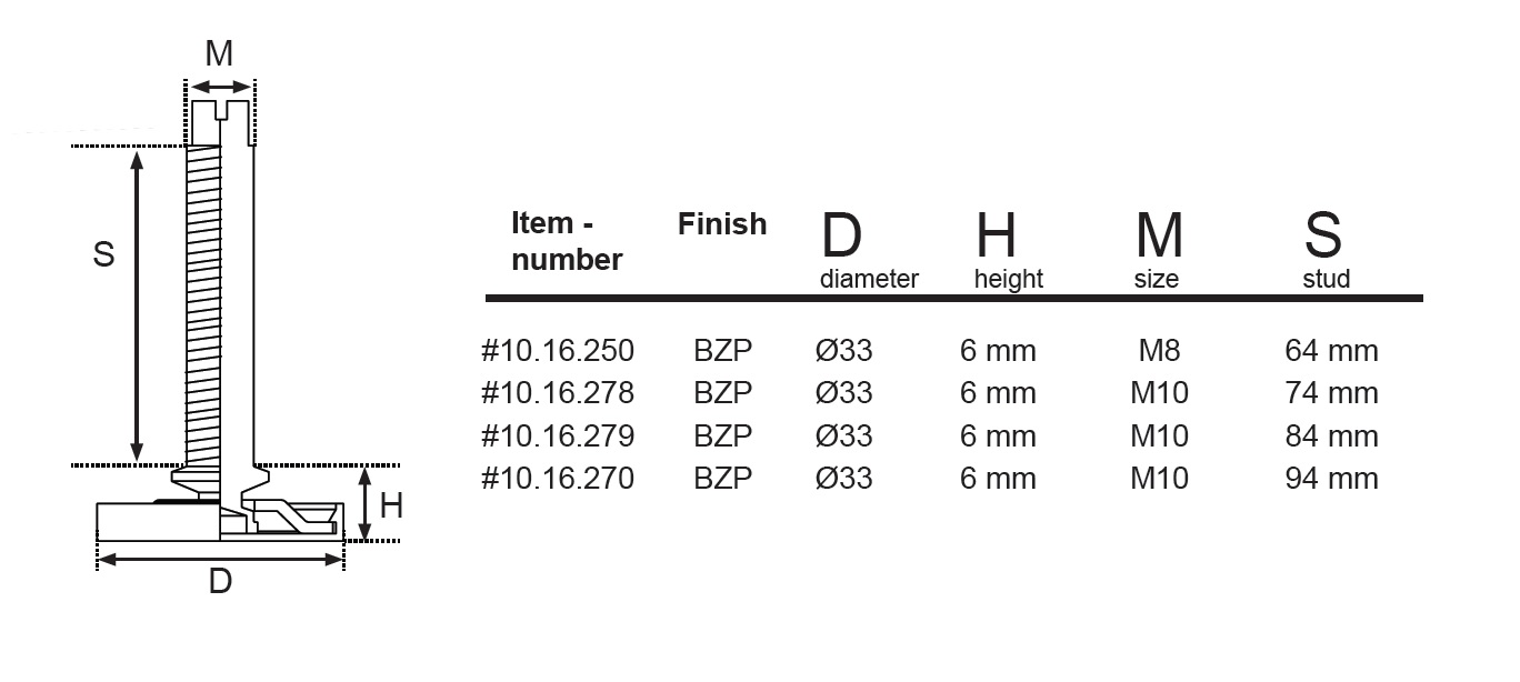 Adjust. Swivel Glide Como, ø33mm, Steel BZP, Stud M8x64mm, W/Slot in the Top of the Stud. Incl. Transparent Floor Protection Cover