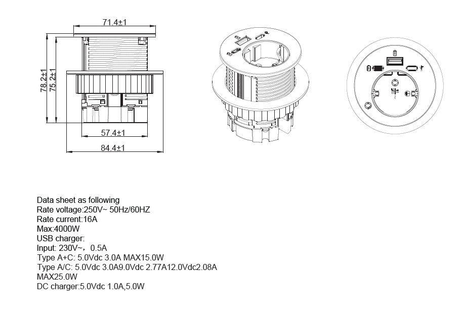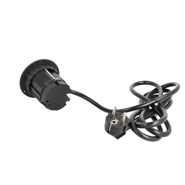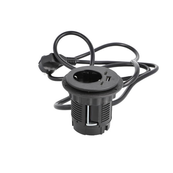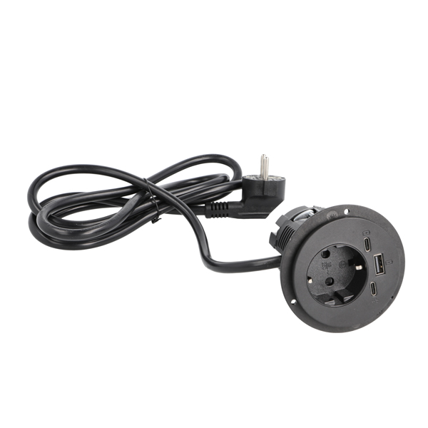 Power Socket, Black, ø60mm,1 EU Socket+2 USB Chargers (A+C) 30W Max, 1 USB C 3,0 Data Extemsion,W/150 cm EU Power Cable, EC/RoHS Certified, Over all Size: 71x79x59mm, Hole Drill: 60mm