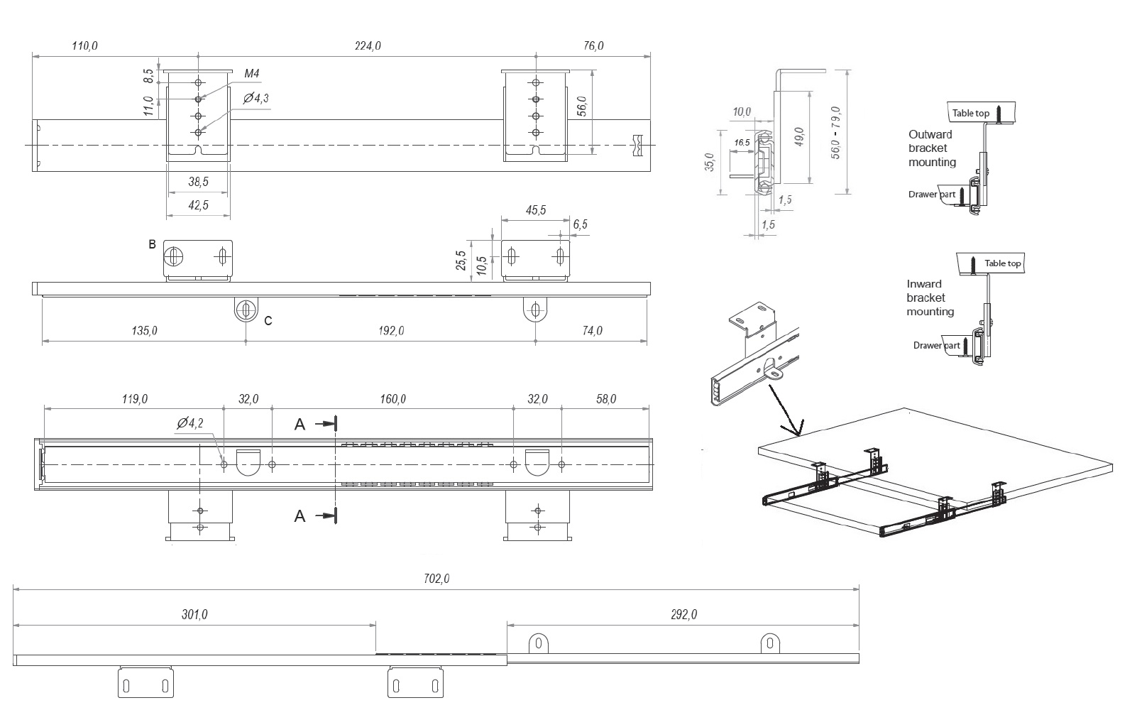 Keyboard Slide NJ2060, 410mm, W/4 Angle Brackets, BZP 35mm Profile Height, 30 KG Load Capacity