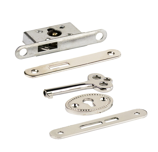 Box Lock, Steel, Nickel Plated, Incl. 1 key, 1 Escutcheon, 2 Striking Plates (Top & Bottom)