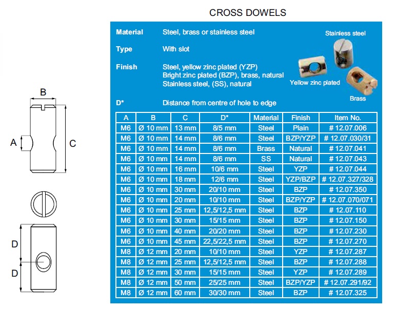 Cross Dowel ø10x20mm(10+10), M6, Steel, Yellow Zinc Plated