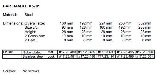 Bar Handle 5701, cc 160mm, ø10x250mm,Steel,SS-Look,No Screws