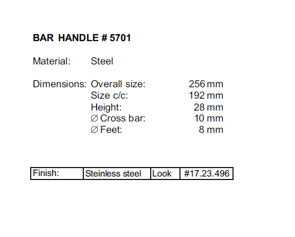 Bar Handle 5701, cc 192mm, ø10x256mm,Steel,SS-Look, W/Screws