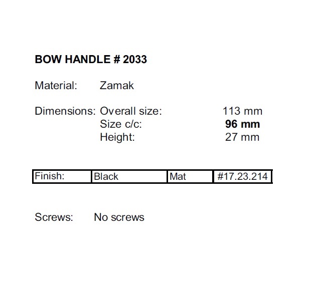 Bow Handle 2033, cc 96mm, Matt Black, No Screws