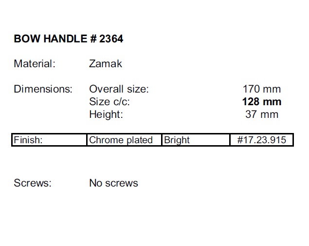 Bow Handle 2364, cc 128mm, Zamak, Chrome Plated, No Screws