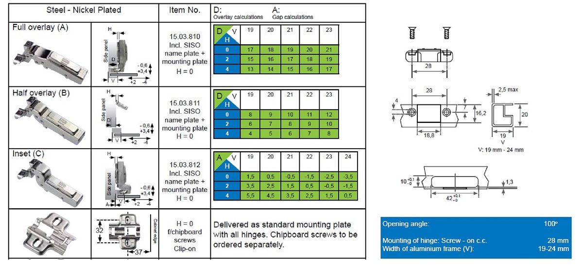 Alu Frame Hinge "A", Clip-On, 100DG, NPL, H=0, W/Plate F/ Wood Screws , Full-Overlay, W/SISO DK Name Plate, No Screws, F/19-24mm Alu Frames, cc:28mm On Hinge Head