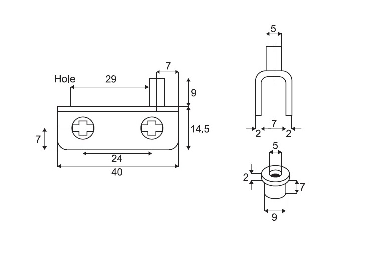 Glass Pivot Hinge No. 11.561, 9mm, Chrome Pl, L+R, 40x15mm F/4-5mm Glass, Metal Screw W/Plastic Tip, ø9 x 7mm Bushing
