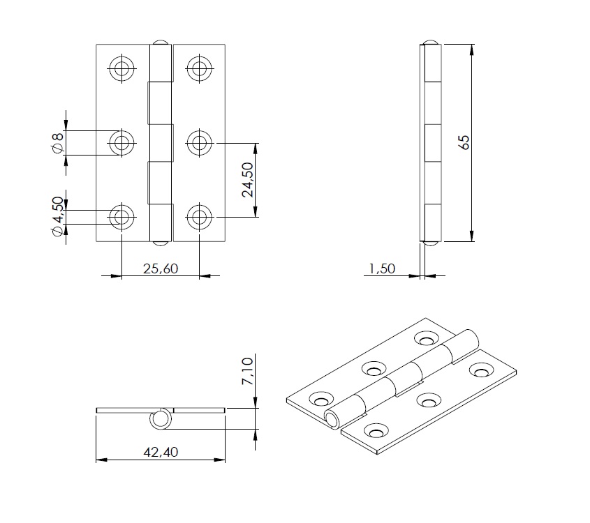 Butt Hinge, 65x41x1,5mm, Steel, BZP, 6 CSK Holes