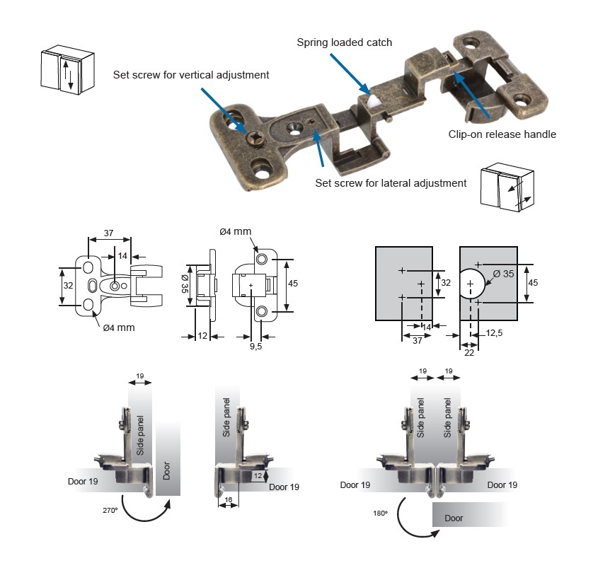 Wide Opening Hinge 270 DG, F/19mm Panel, BRZ, Clip-on, Overlay, F/Wood Screws