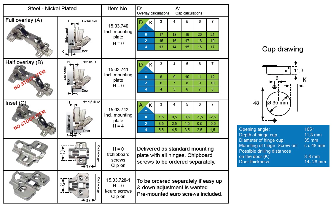 Maxi Hinge, "A" Clip-On, 165DG, NPL, Full-Overlay,W/Plate F/ Chipboard Screws,H:0mm, ø35mm Cup, cc:48mm - 6mm, Cup Height: 11,3mm, Name Plate Not Possible