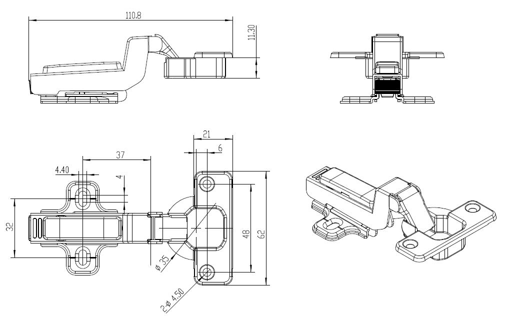 Maxi Hinge "C", Clip-On, 100DG, NPL, ø35mm, H=0, W/Plate F/ Wood Screws, Cup: cc:48mm, Inset, W/SISO Name Plate, Can Be Used Together With 15.03.733-5