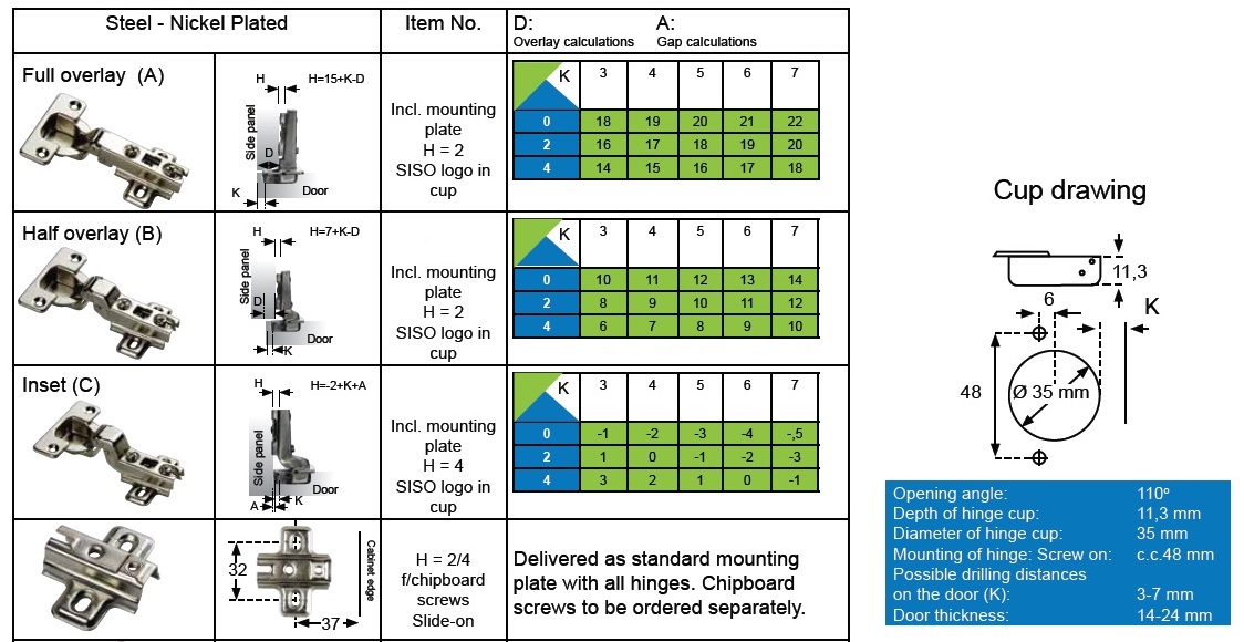 Maxi Hinge, Steel, NPL, 110DG, A/00mm Full-Overlay, With Mouting Plate H:2mm F/Chipboard Screws, ø35mm Cup, cc:48mm - 6mm, Cup Height: 11,3mm, NPL, Slide-On