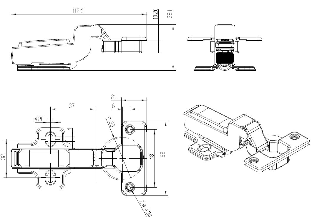 Soft Closing Hinge "C",ø35mm,Clip-On,H=0,Plate F/Wood Screws Inset Doors, 100 Degree, Cup cc.:48mm,Mounting Plate F/Wood Screws, H:0mm,W/SISO Name Plate,Hydraulic Plastic Pump