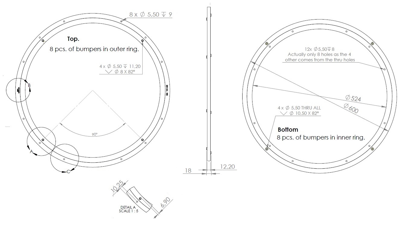 Lazy Susan Alu. Swivel, ø600x12mm, ID 524mm, ø6mm SS-Ball Bearing, Load Capacity: Max 190Kg, 4 CSK Holes, 6 White Rubbers ø10,2 x 3,3mm on each side