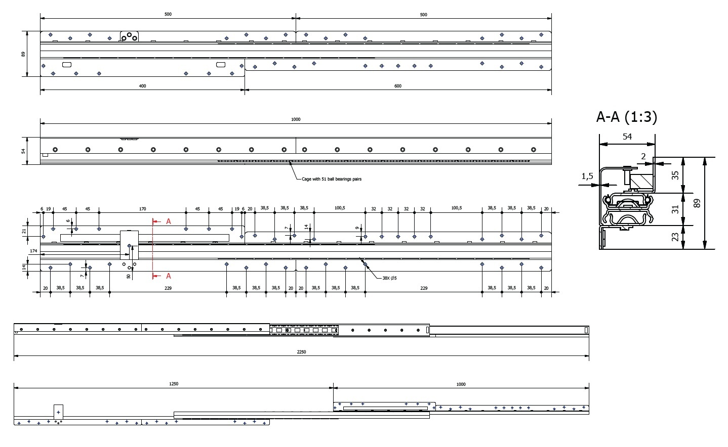 Drawer Slide F/Understair Drawers,1000mm, Steel - Black, W/ Soft Close, Bottom Fixing, 1250mm Opening, 2050mm Total Open Length, 1000mm Closed Length, 54mm Mounting Height, 100 KG Load Capacity