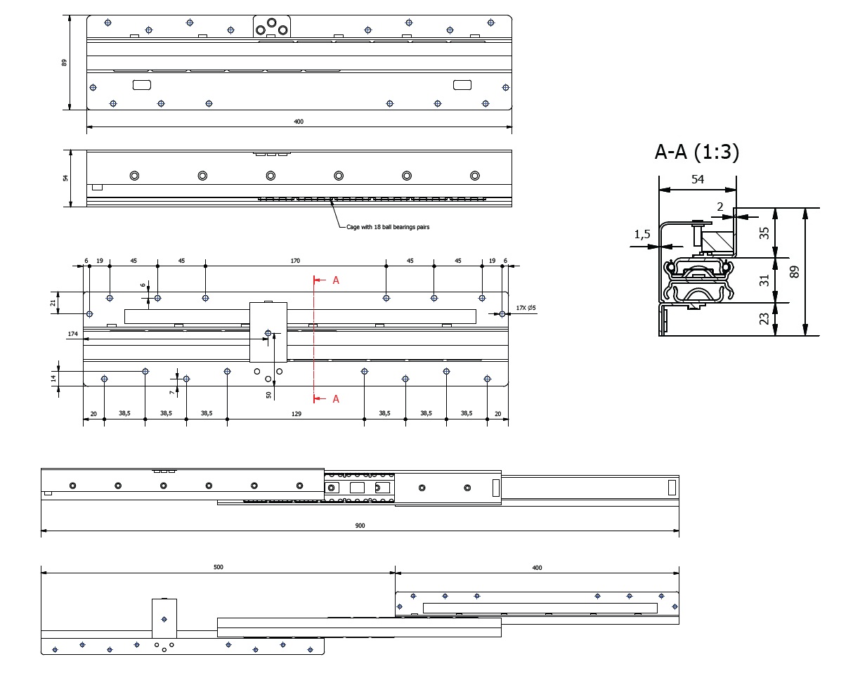 Drawer Slide F/Understair Drawers, 400mm, Steel - Black, W/ Soft Close, Bottom Fixing, 500mm Opening, 900mm Total Open Length, 400mm Closed Length, 54mm Mounting Height, 100 KG Load Capacity