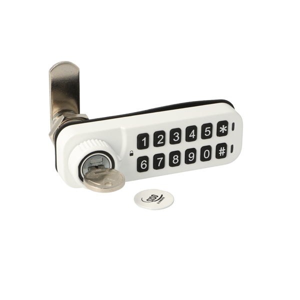 Elec. Combi. Cam Lock, "VIC", ø19x30mm,Horizontal, RH, White All Zamak, Public/Private, W/Master Key System #07, 3 Level Management, W/Auto-timer Function, IP65 Rating, Powered by CR2450 Button Battery, 30.000 Cycles, CE, REACH and Rohs Certified