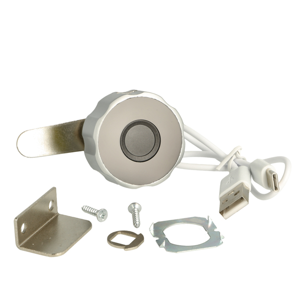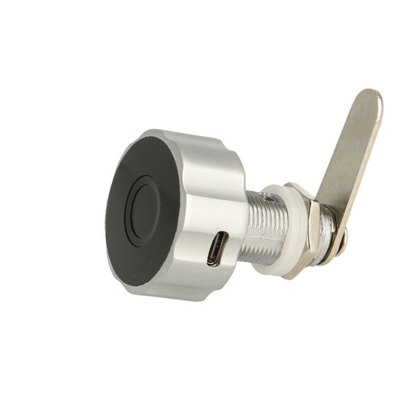 Elec. Finger Print Cam Lock "Fred",ø19x30mm,ø40mm,Zamak Knob Silver/Black,W/USB C Charging Cable,Straight Cam ce: 39,5mm, 90 Degree Turn, W/Built-in Lithium Battery, Operated by TUYA App, Reset E-Key may be bought Separately