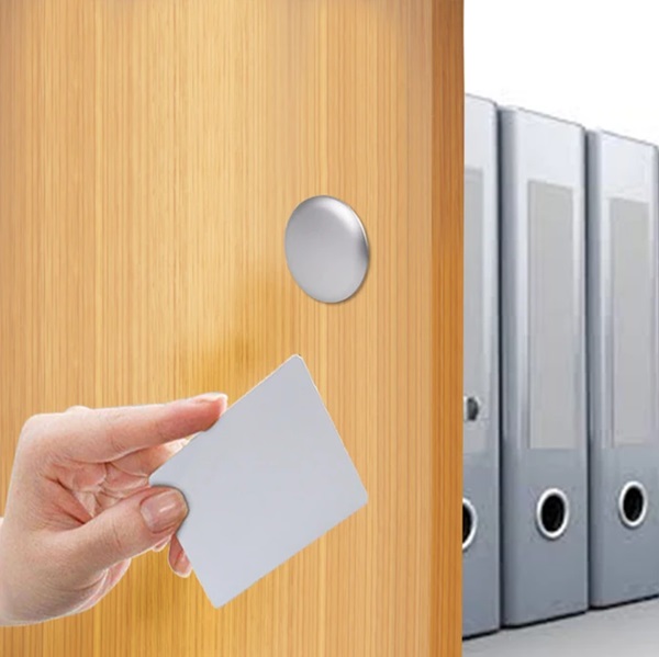Invis. Mifare1 Lock "Mini" W/100mm Antenna, 61x61x22mm, Black ABS Body, W/Light Grey Card Reader Knob (No Logo), 1xCR123A Batt. Lithium To Be Bought Separately, Can be Programed to Public, Private or Office Mode W/Non Locking & Low Battery Alarm, Striker & Protection Cover to be Bought Separately