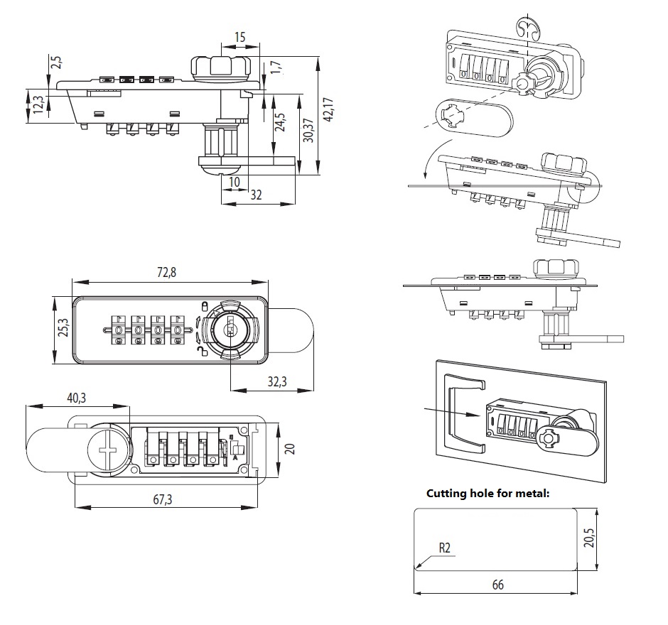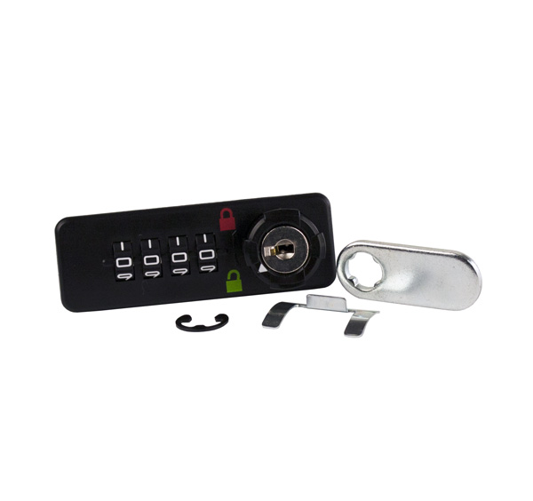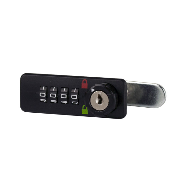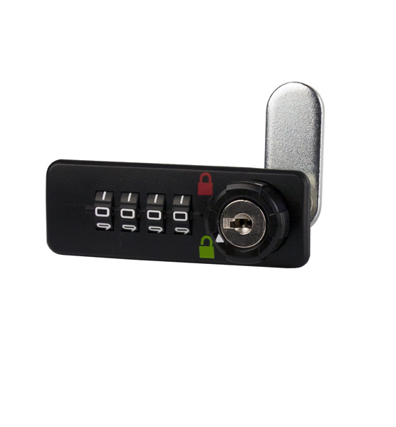 Combi. Cam Lock M224, Private, 4-Digit,LH,90DG,Black,MK+Code Finder (Direct), Black, 73X25X12mm, Straight Cam C/E:32mm, Closed 3 O´Clock, Open 12 O´Clock, Pre-coded 0000, Changing Code by Switching Button from A To B & Back, MK Code 201, Cylinder Centre to Edge of Lock Body: 12mm