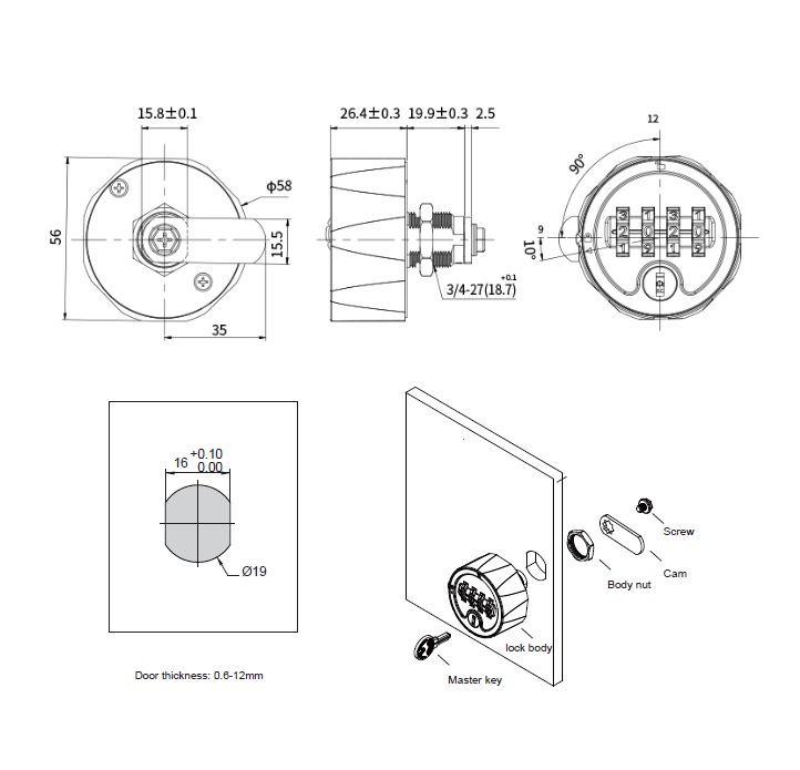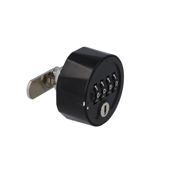 Combi. Cam Lock M500, Private, 4-Digit, ø19x20mm, RH, Black Zamak, ø56x26,5mm Housing, 90DG, Straight Cam, C/E:35mm, W/Hex Nut, Pre-Coded 1111, Changing Code By Turning Lock Body 10DG Counter Clockwise,Code Finder by use of Master Key Code #08, With Scramble Function, Door Thickness 0,6-12mm