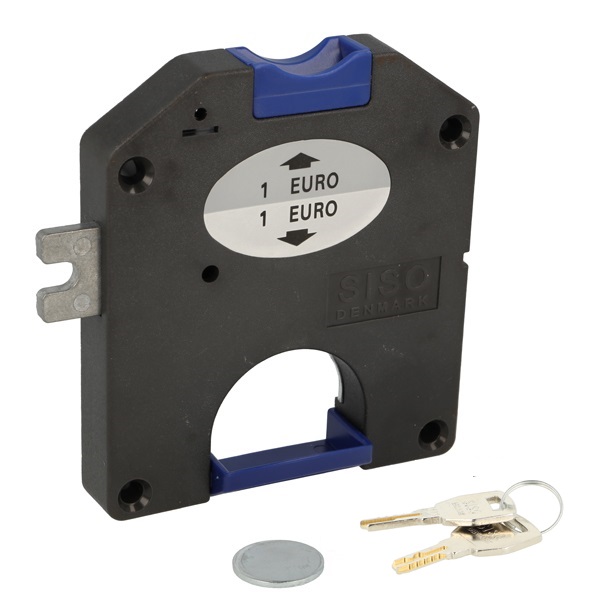 Coin Lock F/1 Euro,W/MIC System #01,CPL, LH,Snake SISO Metal Keys, Black Plastic Body, Coin Entrance & Exit All Blue Plastic, W/SISO Logo on Lock Body, w/Chrome Plated Rosette, Included 1 Master Key + MIC Key Pr. Inner Box