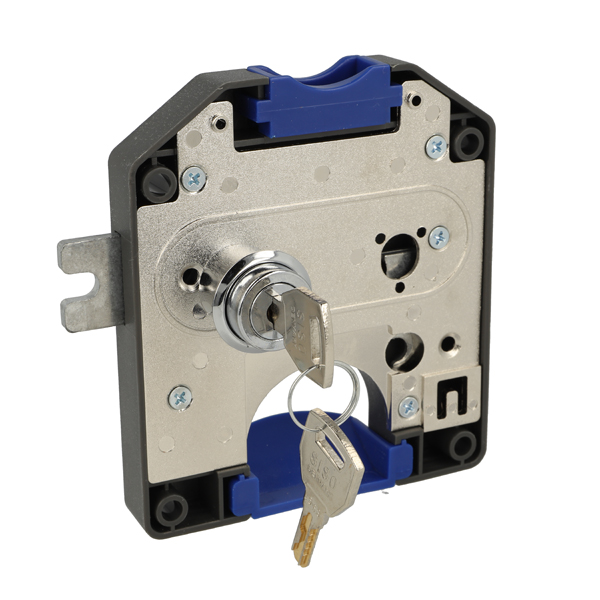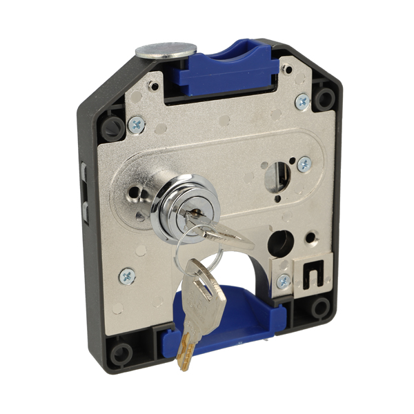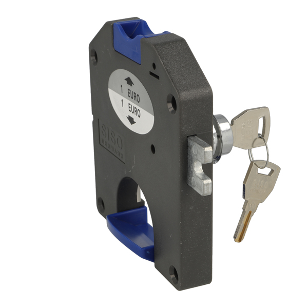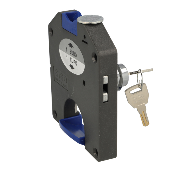 Coin Lock F/1 Euro,W/MIC System #01,CPL, RH,Snake SISO Metal Keys, Black Plastic Body, Coin Entrance & Exit All Blue Plastic, W/SISO Logo on Lock Body, w/Chrome Plated Rosette, Included 1 Master Key + MIC Key Pr. Inner Box
