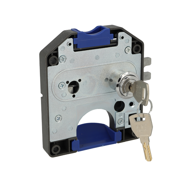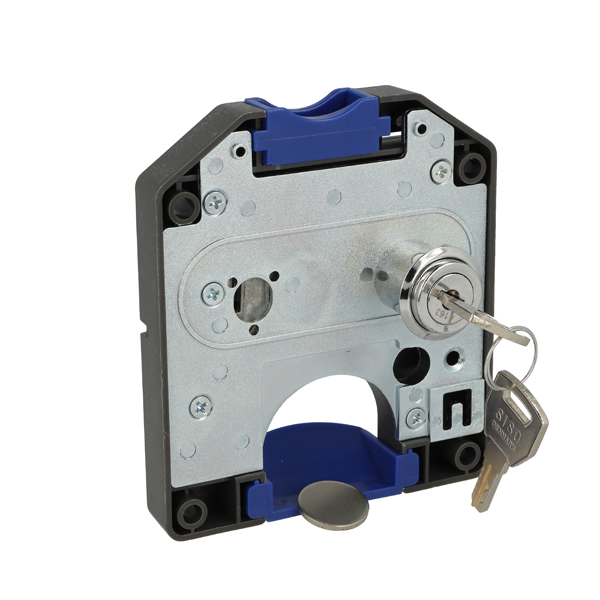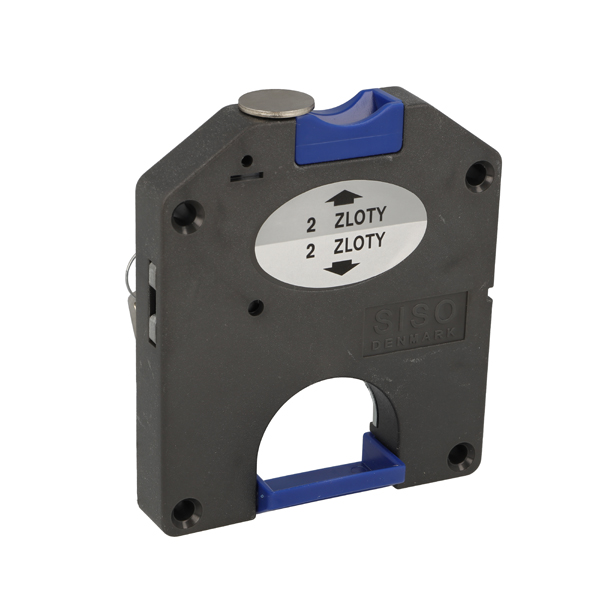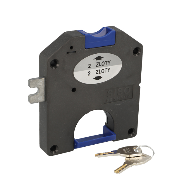 Coin Lock F/2 Zloty,W/MIC System #01,CPL,LH,Snake SISO Metal Keys, Black Plastic Body, Coin Entrance & Exit All Blue Plastic, W/SISO Logo on Lock Body, w/Chrome Plated Rosette