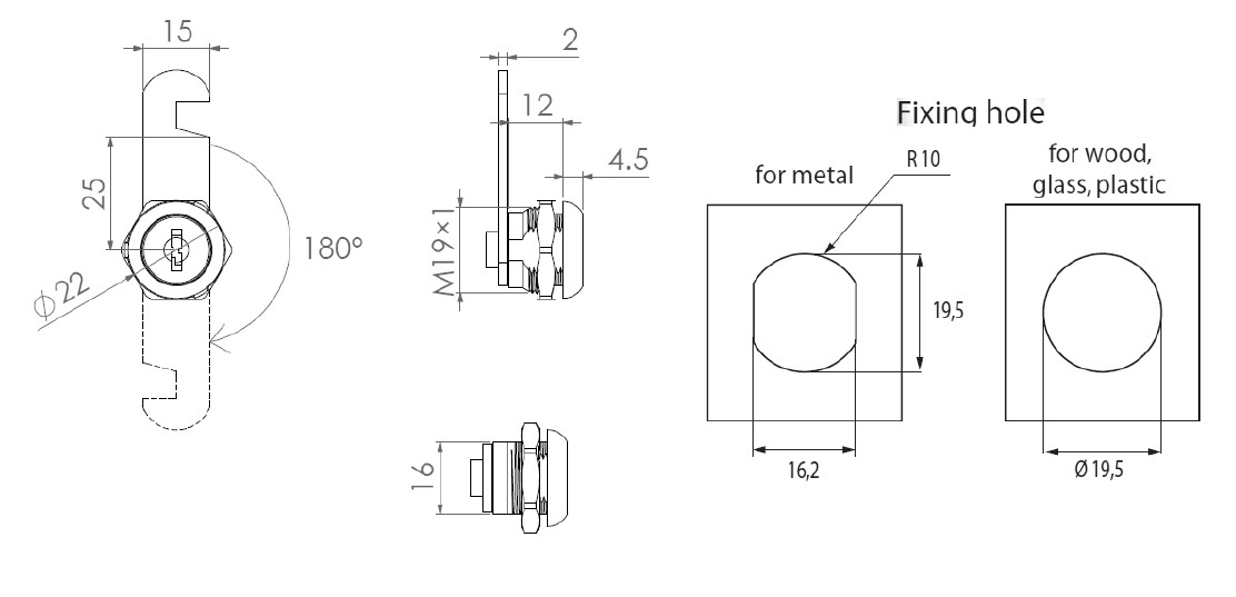 Cam Lock 1912, 180DG, Cam A09 Hooked,LH, KA D20, CPL,CK SISO Cam Mounted 12 O´clock when Open, W/Hook Opening on Right Side, F/Left Hand Doors, Cam Plate Riveted onto the Lock,Max 6mm Panel Thickness
